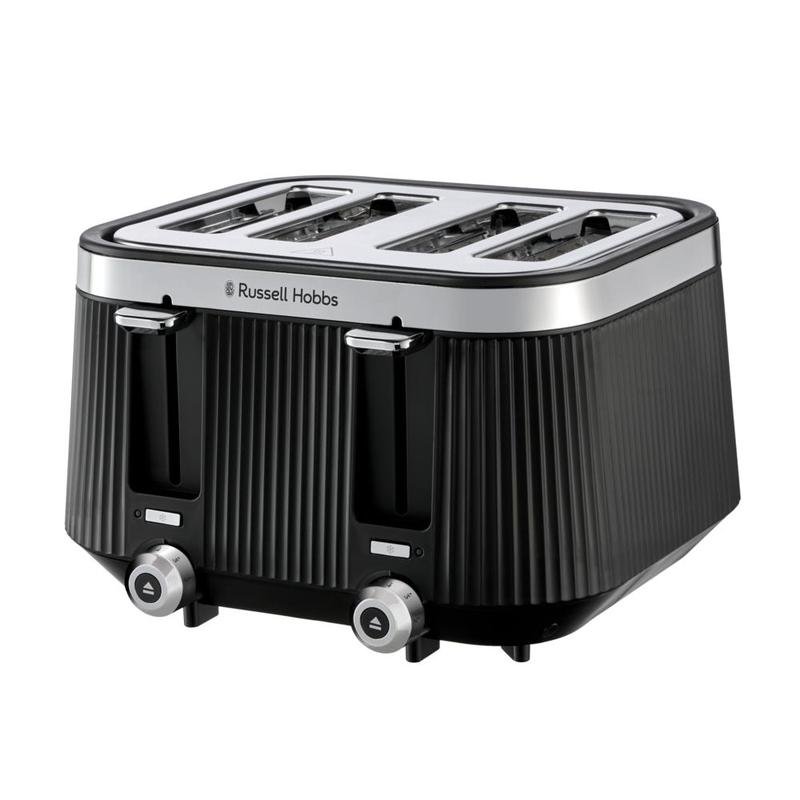 A Touch of LuxuryAdd style and quality to your kitchen with the Russell Hobbs Brontë collection, designed to stand out while you settle in for your breakfast cuppa and toast. A stylish design, chrome accents, and its stunning interior illumination come together to make this kettle a focal point for your kitchen. Check on your slice without stopping the cycle with the Lift and Look feature and raise toast with the help of the high lift feature. The frozen, reheat and cancel functions allow you to create the perfect golden crunch, and the indicator light will glow until the pop. ·Lift and Look for Perfect Toast – No more guesswork! The Russell Hobbs 4 slice toaster features a Lift and Look lever, letting you check your toast mid-cycle without interrupting the process.·High Lift for Small Items – Safely retrieve crumpets, bagels, and small slices with the high lift feature on this 4 slice toasters wide slots, so you never risk burnt fingers again.·Frozen, Reheat & Cancel Functions – Whether toasting frozen bread, reheating a cooled slice, or stopping the cycle, this Russell Hobbs toaster gives you complete toasting control.·Distinctive Matte Black Design – Designed to impress, this toaster with wide slots has a modern matte black finish with stainless-steel accents, adding a stylish touch to any kitchen.·Illuminated Indicator Light – Know exactly when your toast is ready! The handy indicator light on the Russell Hobbs toaster stays on until your perfectly crisp toast pops up.
